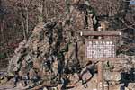 柱に化けた溶岩「材木岩」 さらに、湖畔を行くと、乙女の像の右手前に材木岩と呼ばれる大きな岩塊がある。恵比須大黒島と同じく溶岩(玄武岩質安山岩)で、岩肌の割れ目は、溶岩が冷えて固まる ときにできたもの。柱を積み重ねたように見えるところから柱状節理といわれている |