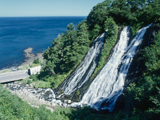 オシンコシンの滝 斜里とウトロを結ぶ国道334号沿いにあり、途中二筋に分けれて落ちるため、「双美の滝」とも呼ばれる。白い帯状に流れる滝がもっとも美しいのは、知床連山の雪解け水が流れ落ちる、新緑の頃。滝上には散策路が付けられており、頂上にはオシンコシン展望台がある。 |