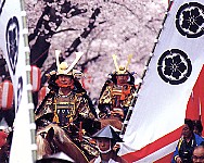 城下町小幡さくら祭り武者行列 馬上の大将と続く約200人の武者行列は、織田家に由来しはじめられたものです。織田信雄公を大将に鎧姿の武者をはじめ、槍隊、鉄砲隊、弓隊、女武者、子ども武者、外国人武者、姫君、侍娘等で構成されており満開の桜の下に繰り広げられる戦国絵巻は、華やかで迫力満点です。この行列の出演者は、ほとんどが甘楽町町民であり地域住民が一体となり、イベントに取り組みます。さくら祭りメイン会場の甘楽総合公園お祭り広場では、様々な催しが行われます。当時の火縄銃の実演や殺陣、農産物の販売、野点、小動物とのふれあい等大勢の人で賑わいます。 |