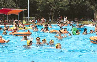 井頭公園 真岡市街地から北へ約5Kmしたところにあります。面積約93.3haの広大な敷地で、中央の池を取り囲む形で、雑木林の丘陵地からなり、自然と人工の調和を配慮してつくられています。園内には一万人プールをはじめ、フィールドアスレチック、ボート池、つり池、テニスコート、サイクリングなど四季を通じ幅広い人たちに楽しめる施設が揃っている |